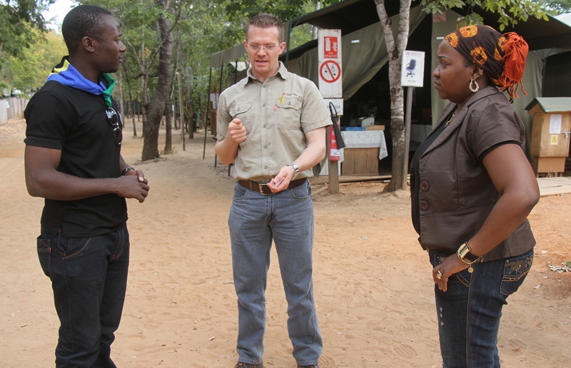 Afisa wa Kitengo cha Usalama wa Kampuni ya Mantra Tanzania,Fredrick Kriel akitoa maelezo ya namna mambo yanavyokuwa pindi wawapo kazini.Kulia ni Mkurugenzi wa Kampuni ya Montage,Teddy Mapunda na kushoto ni Mwanalibeneke Othman Michuzi wakisikiliza kwa umakini.